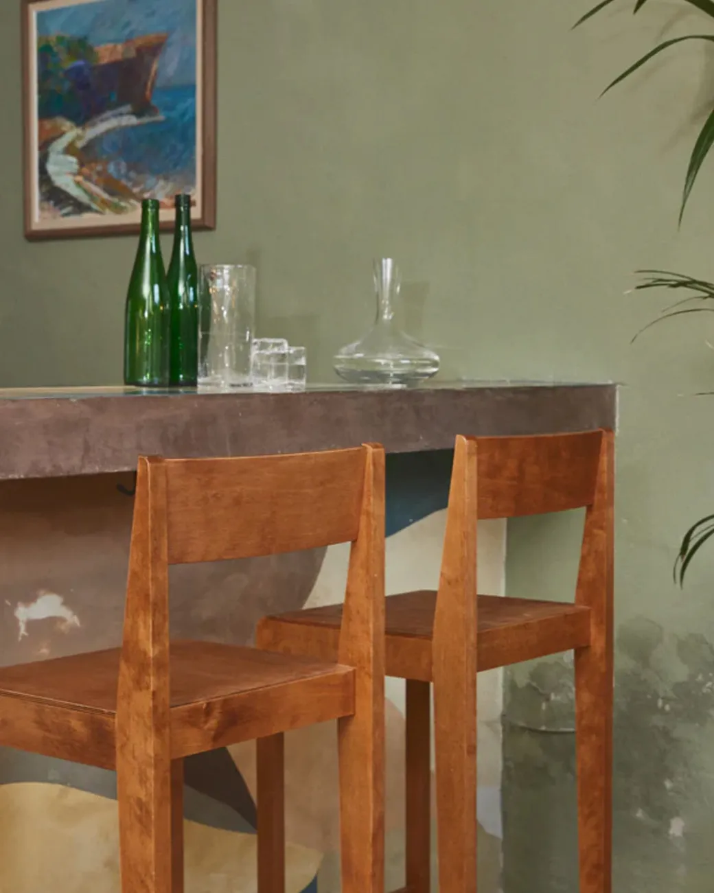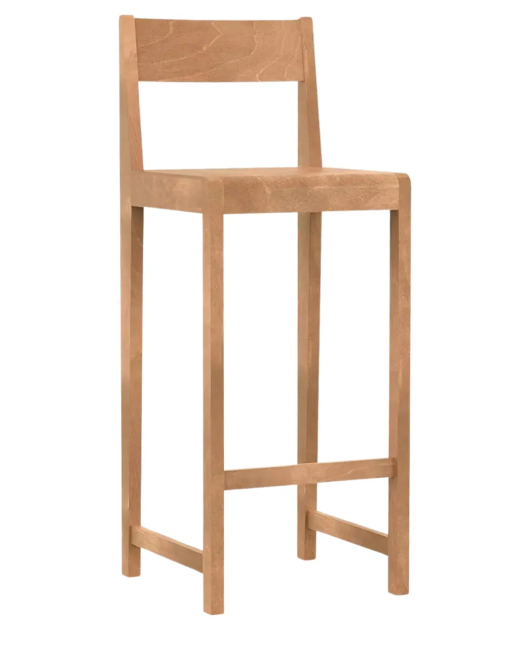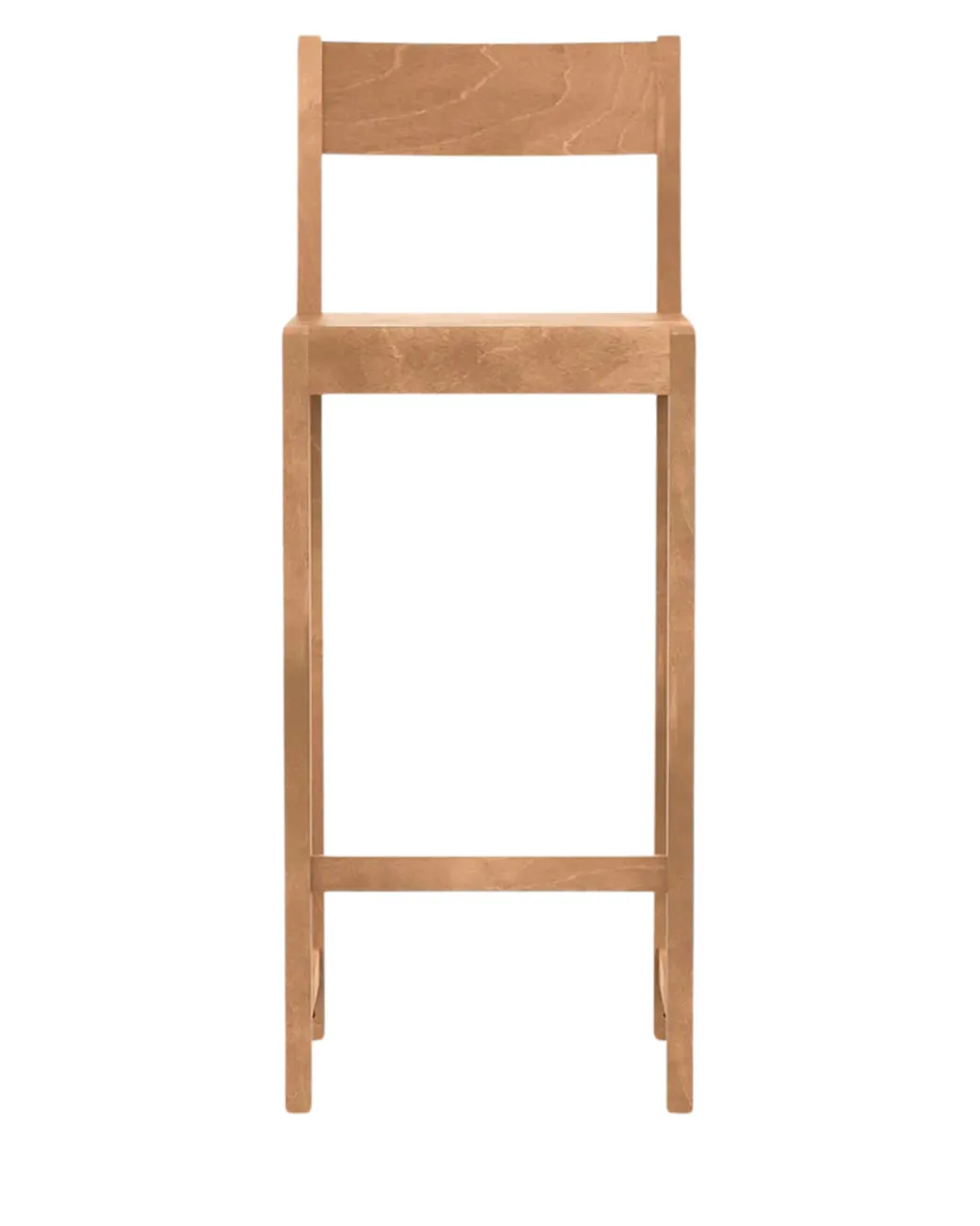 Bar Chair 01 I H76 is defined by a geometric silhouette and a series of stark linear planes inspired by seating commonly found in Nordic churches since the early 20th century. The chair, made from Baltic oiled birch and adapted for bar spaces, comes in various finishes suiting a wide range of environments.