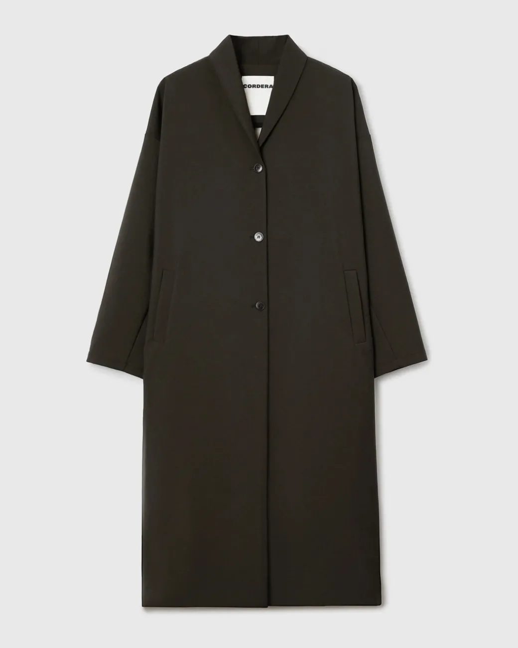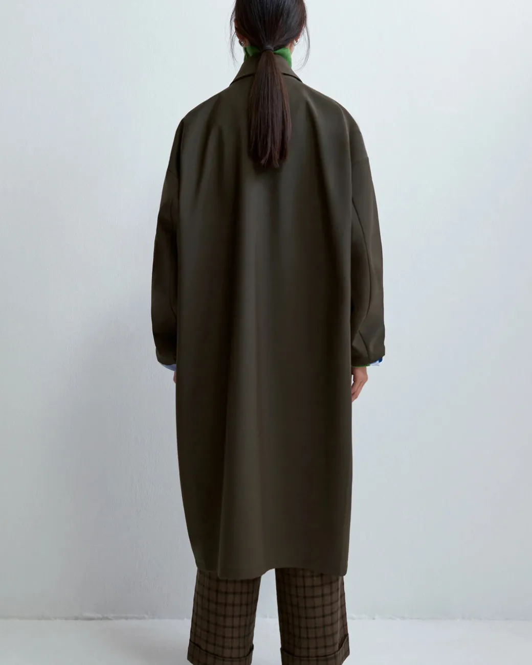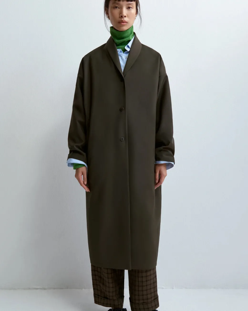 Water-repellent long trench with a timeless design. The maxi volume shape makes this garment the most comfortable and cool to wear.