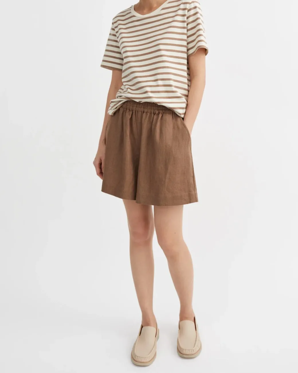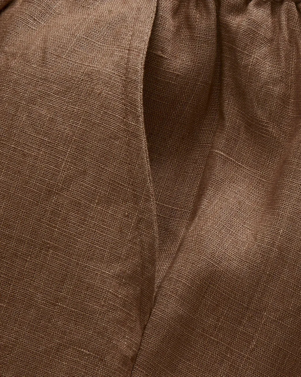 The Edgar Shorts are a pair of comfortable fit shorts crafted from linen. The shorts have an elastic waistband and side pockets.