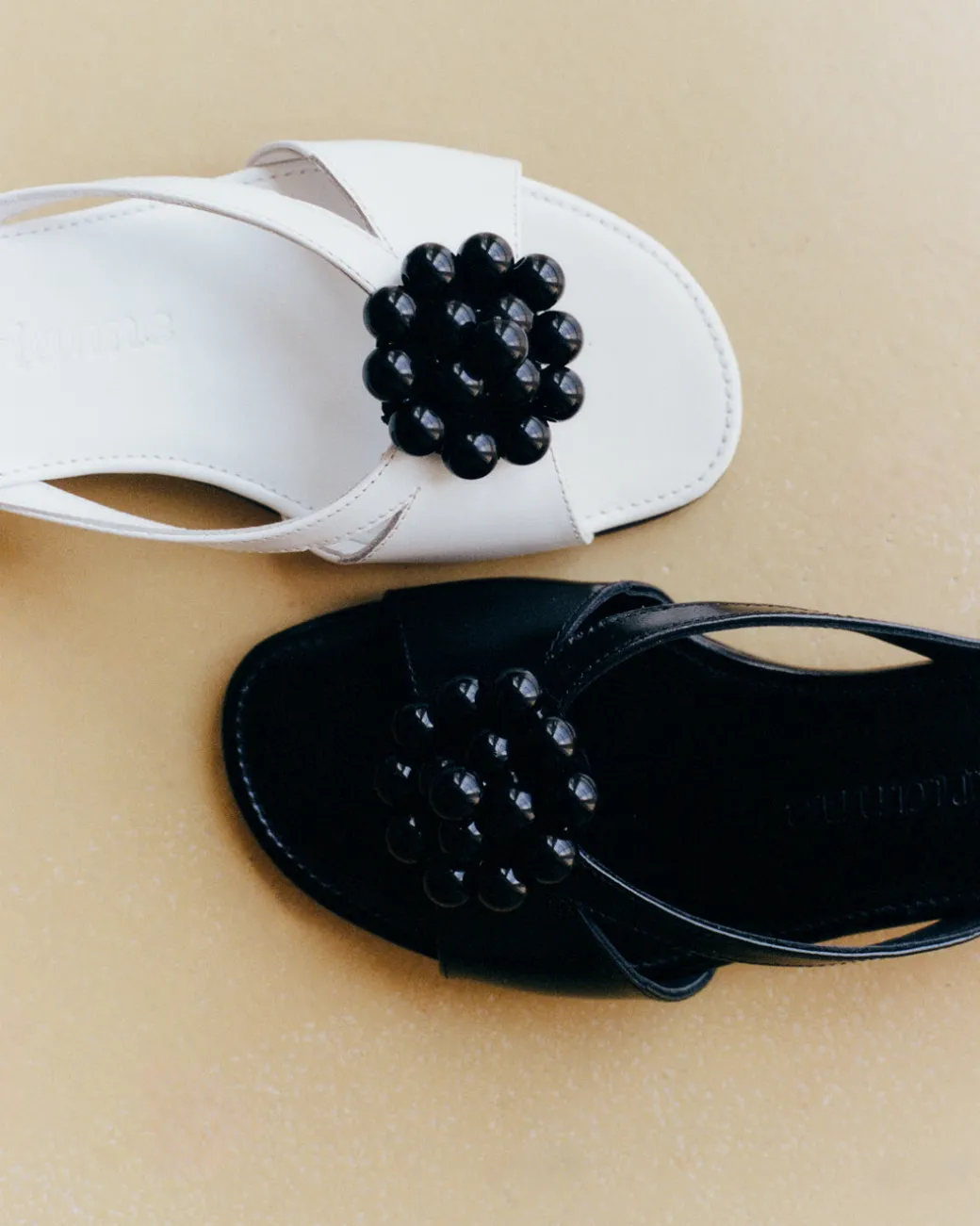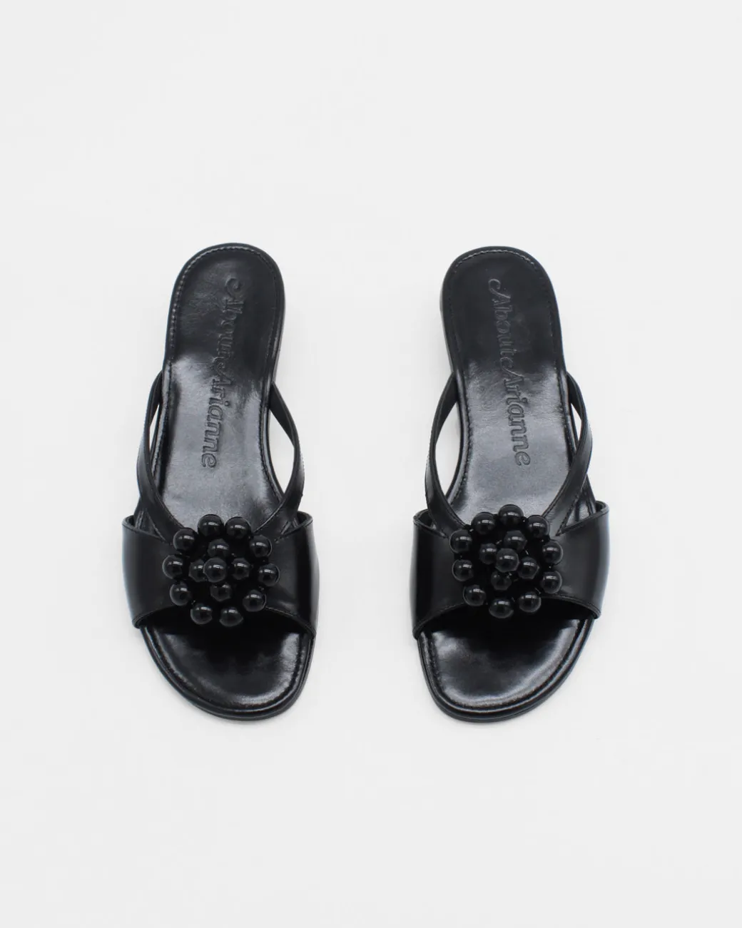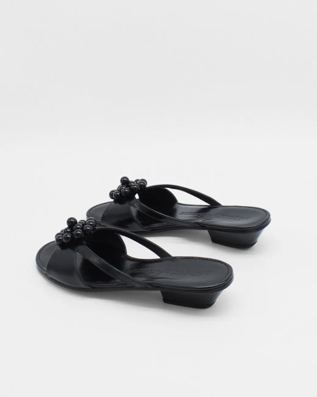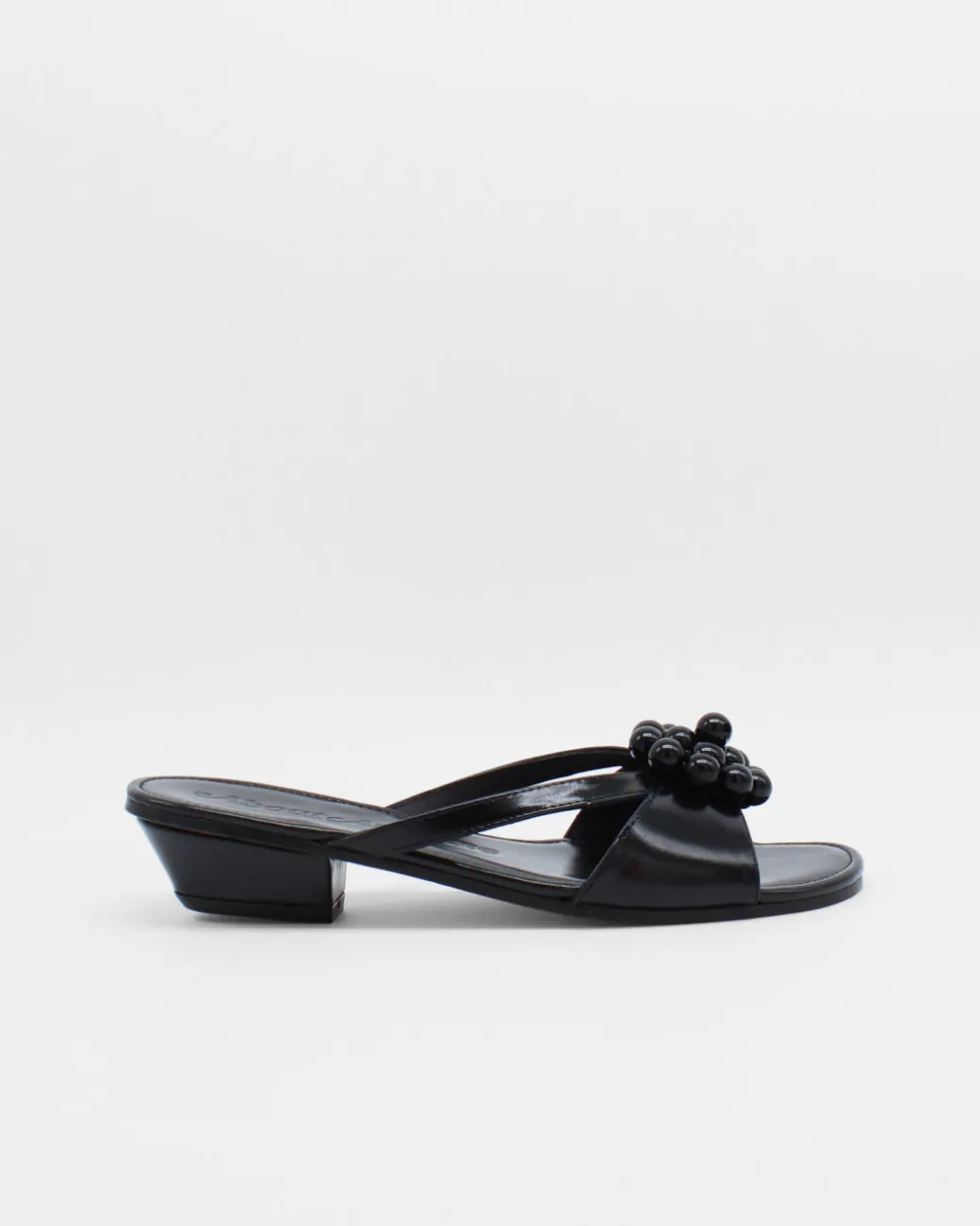 Slip-on sandal with resin applique at vamp, low Cuban heel, and square open toe, made from calf leather.