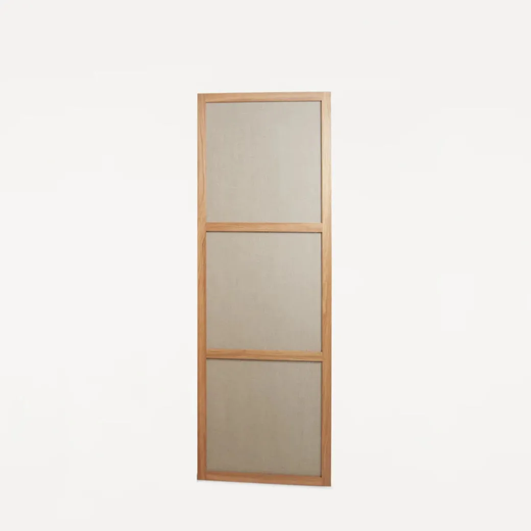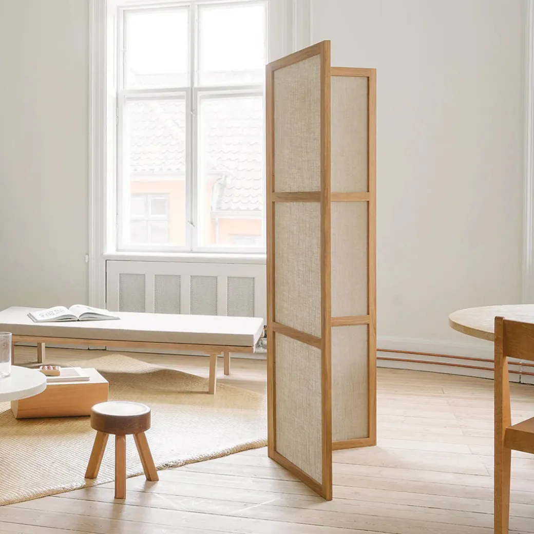 The Frame Room Divider is designed to be a discrete and subtle way of separating any room. Whether you require some privacy, a place for guests to relax, or want to add a spatial element to your home, the Room Divider maintains the same experience of the room and allows for translucency. The free-standing pieces are composed of natural oak and canvas and are held together with strong magnets to form a simple aesthetic and for practicality in moving.