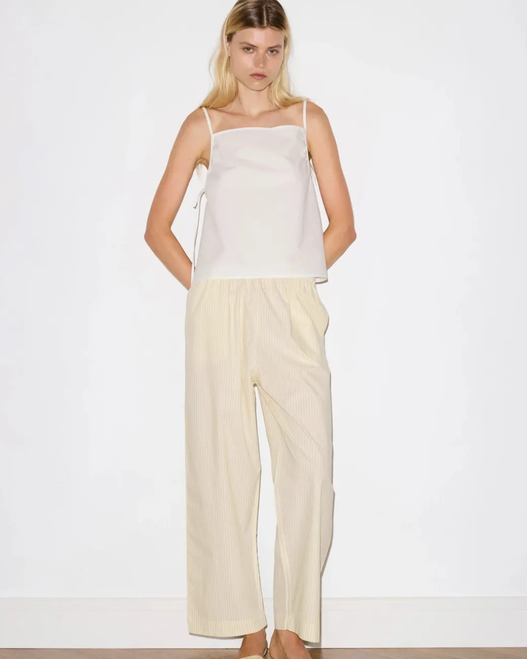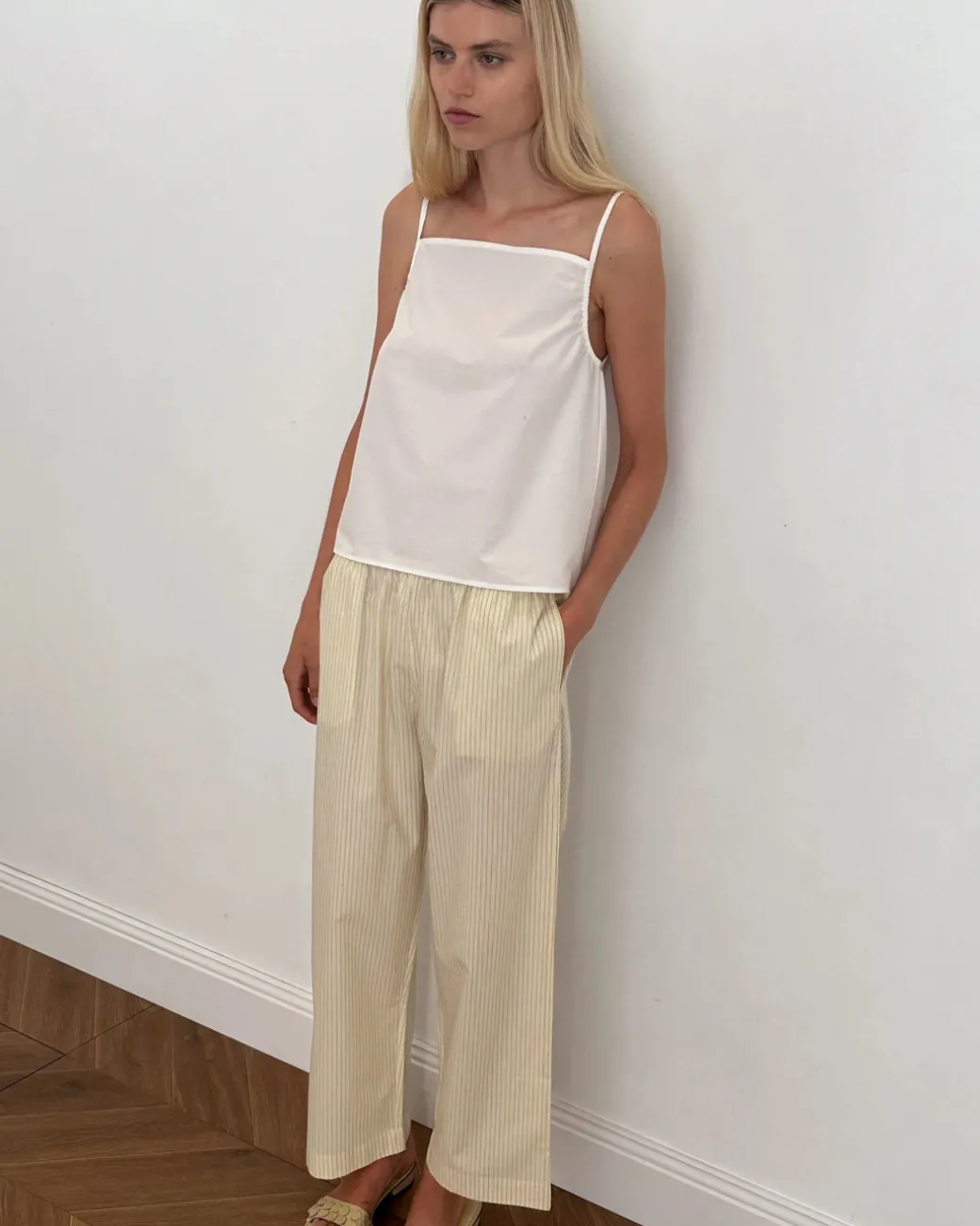 The gathered strap top by Deiji Studios in white