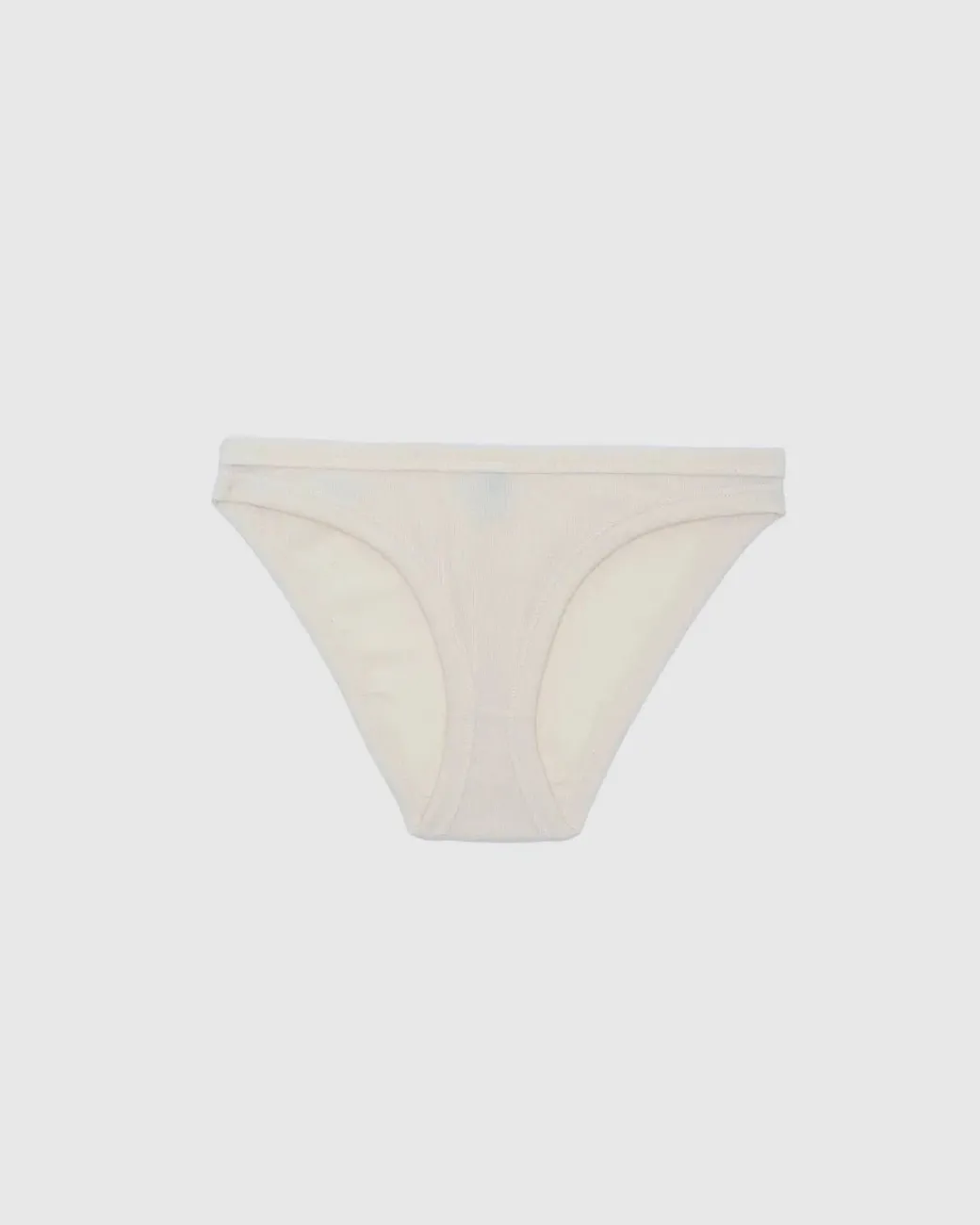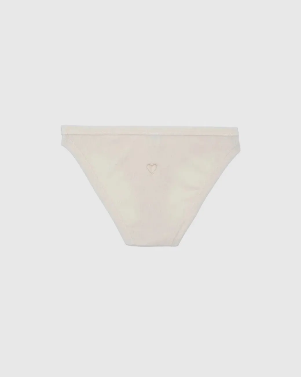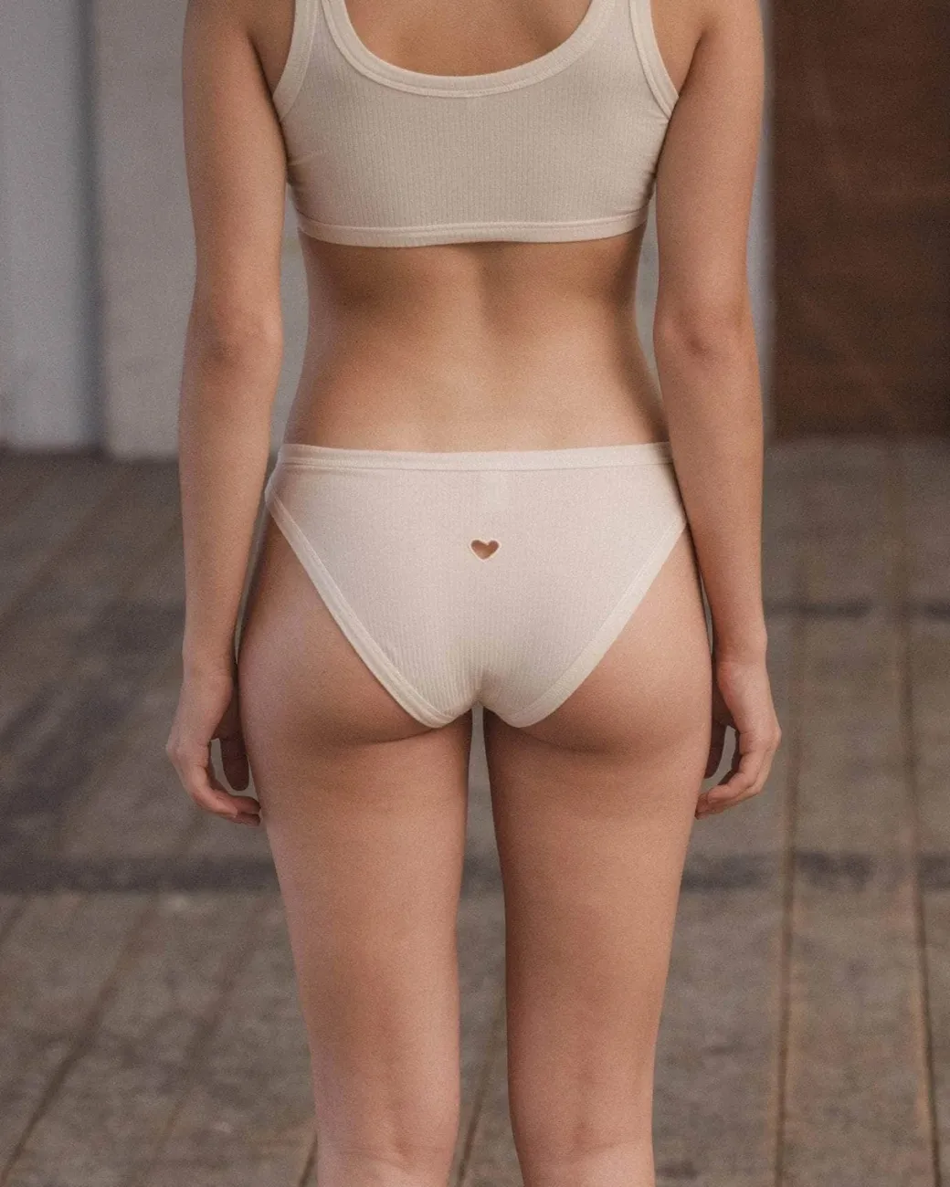Cotton rib briefs with elastic trim at the waist and leg. Heart cut out at the back.