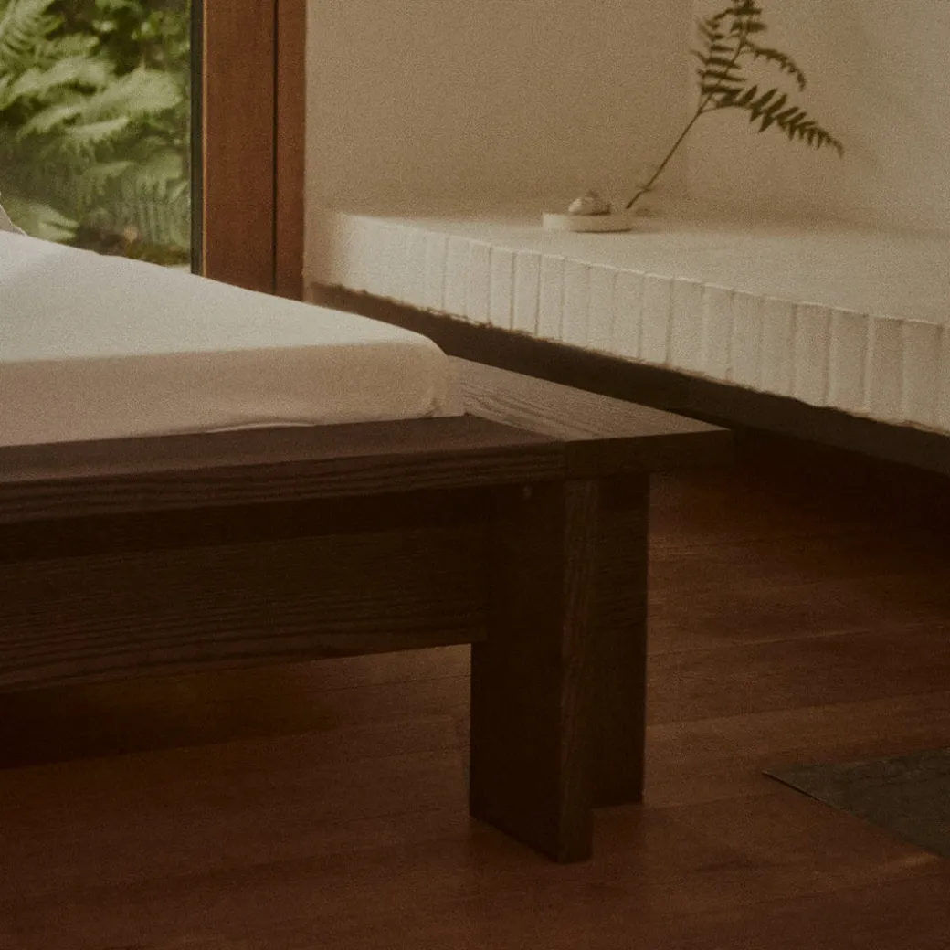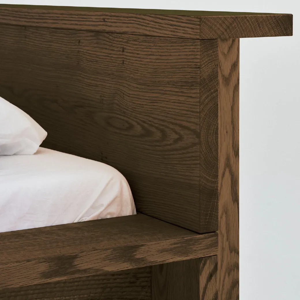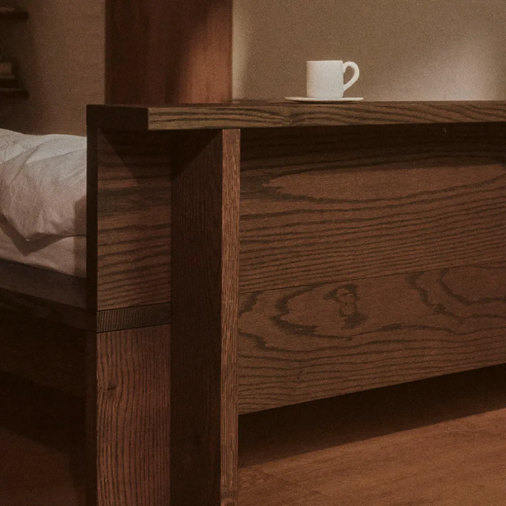 The Hem Bed Frame is a sculptural centerpiece for the bedroom, masterfully crafted from solid red oak.