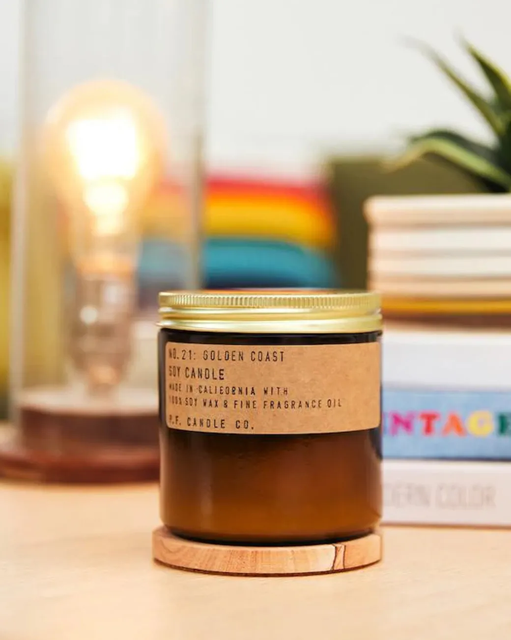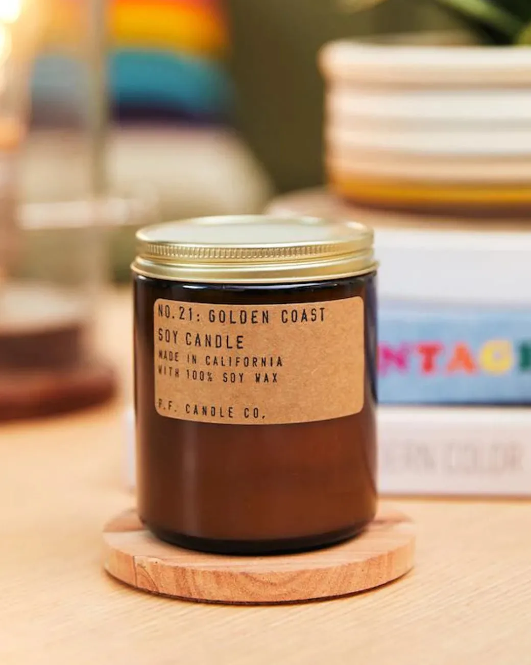 P.F. Candle Co.’s candles are hand-poured into apothecary inspired amber jars with their signature kraft label and a brass lid.