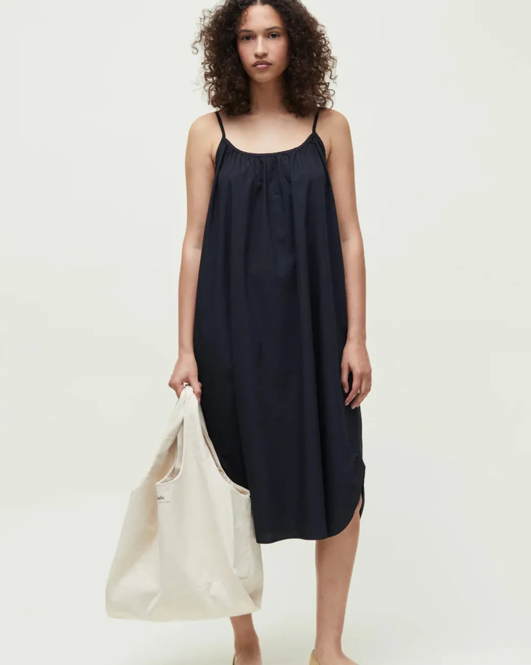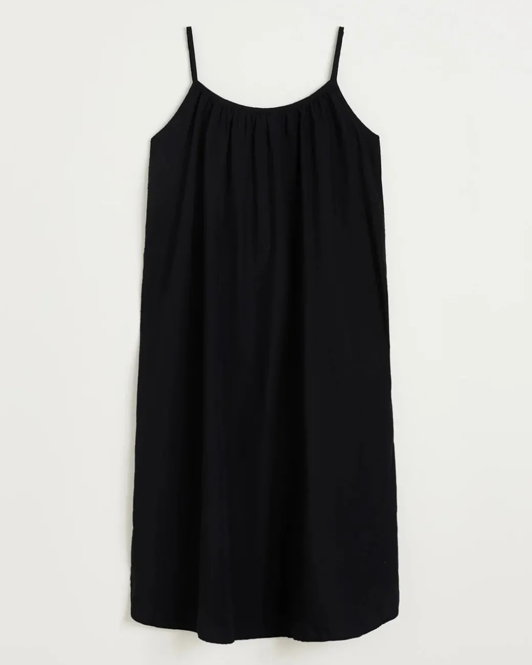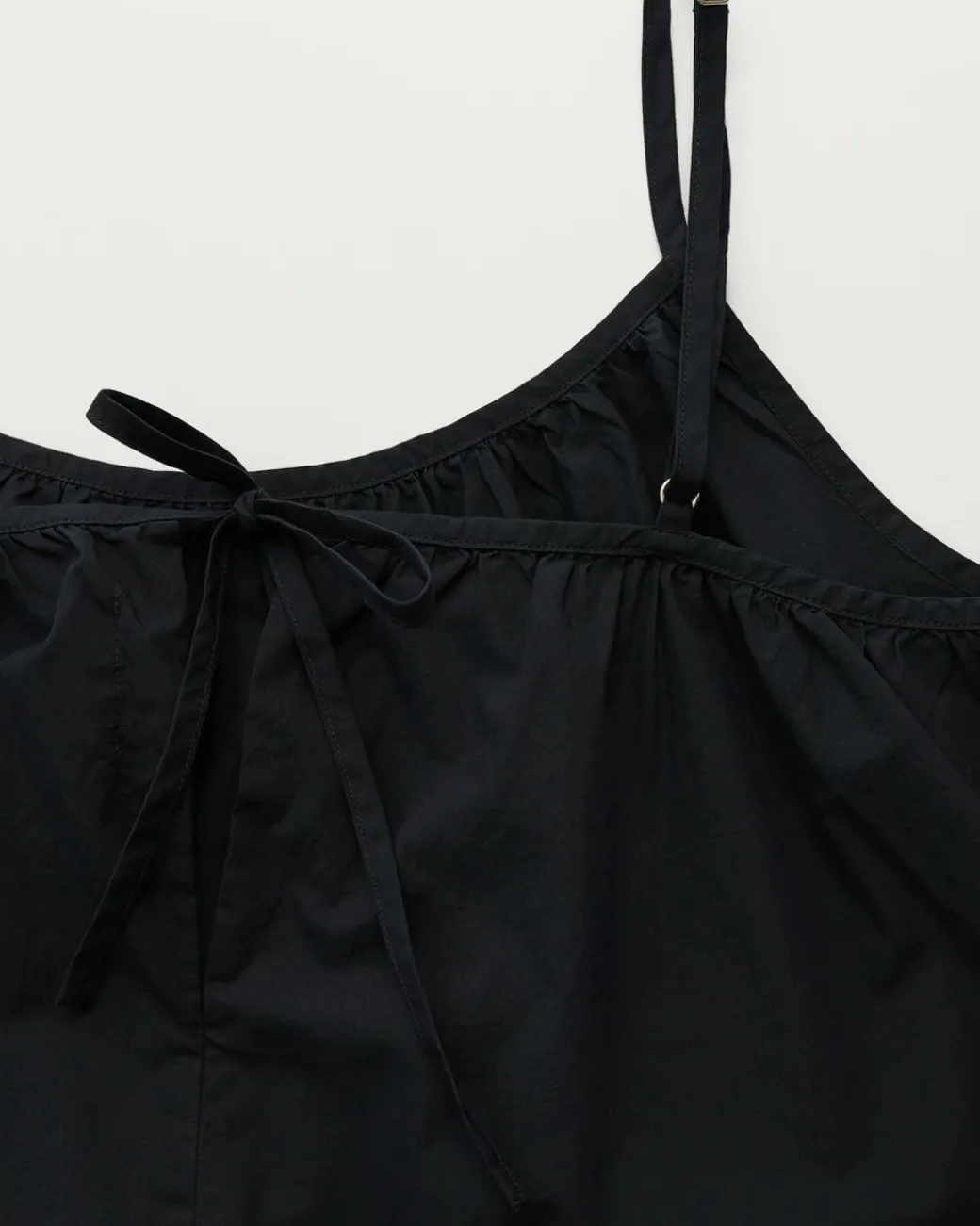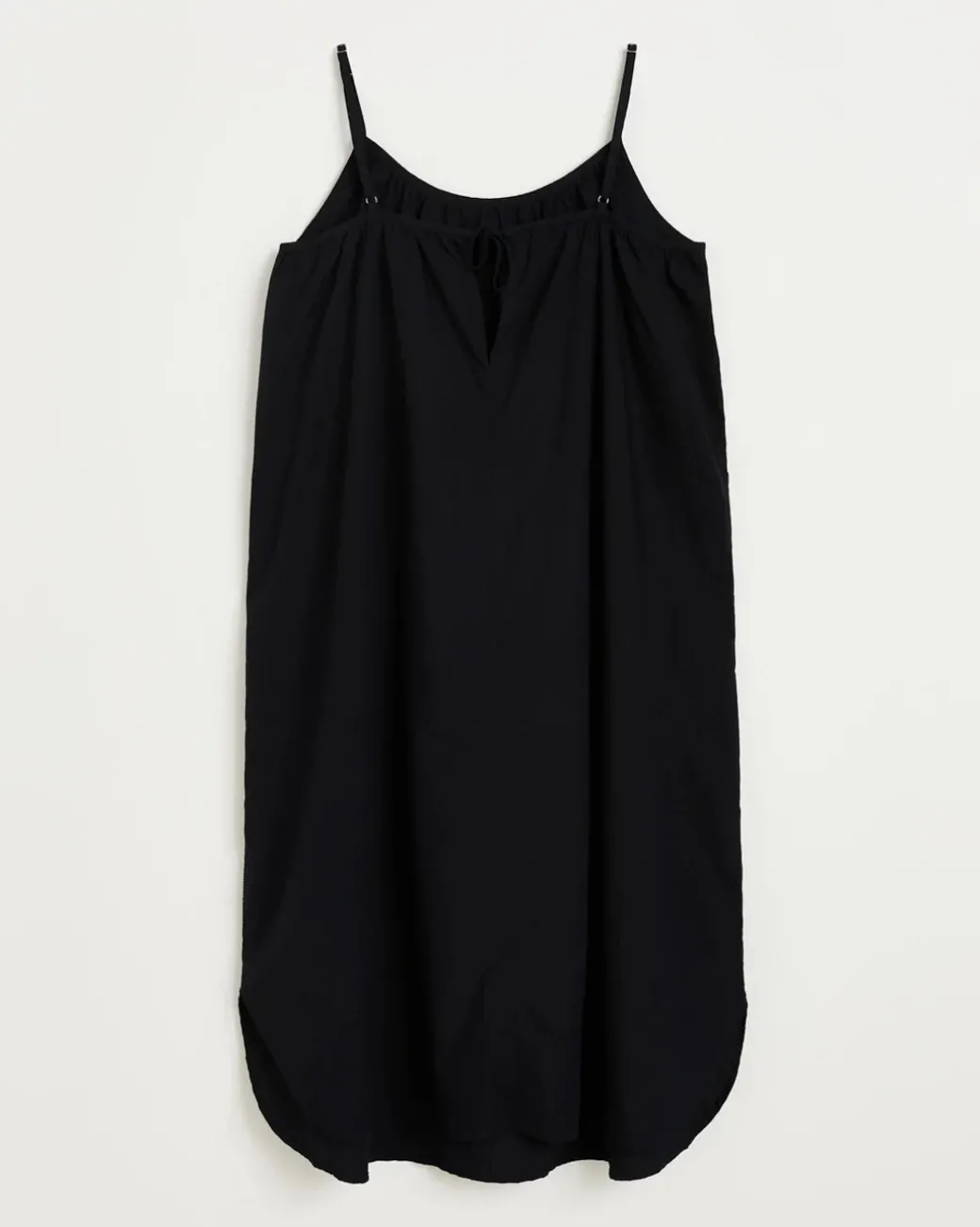 Strap Dress Linen is a light and easy summer dress with a feminine tie detail in the back. The dress features adjustable shoulder straps, a rounded hemline and subtle eyelet embroidery at the side -seam.